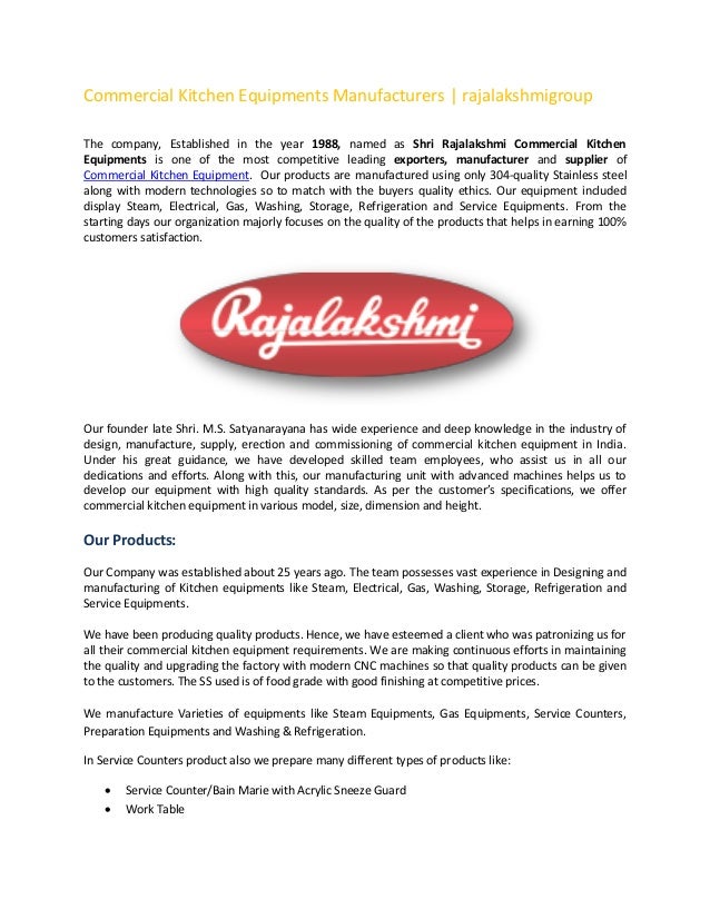 Welcome We introduce ourselves as a specialized manufacturer of Commercial Kitchen and Utility Equipment (both Electricity and Gas Operated) for ... Content Retrieval